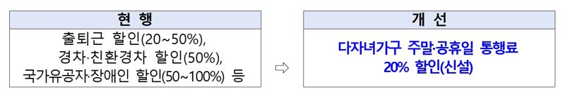 19세 미만 자녀 3명 이상을 양육하는 가구는 주말·공휴일 고속도로 통행료 20%를 감면한다. 우선 3년간 한시적인 제도로 운영된다.