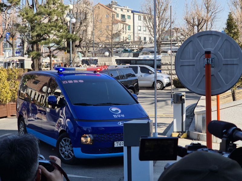 윤석열 대통령을 태운 법무부 호송차량이 23일 오후 헌법재판소 지하주차장으로 들어가고 있다. /사진=최은솔 기자