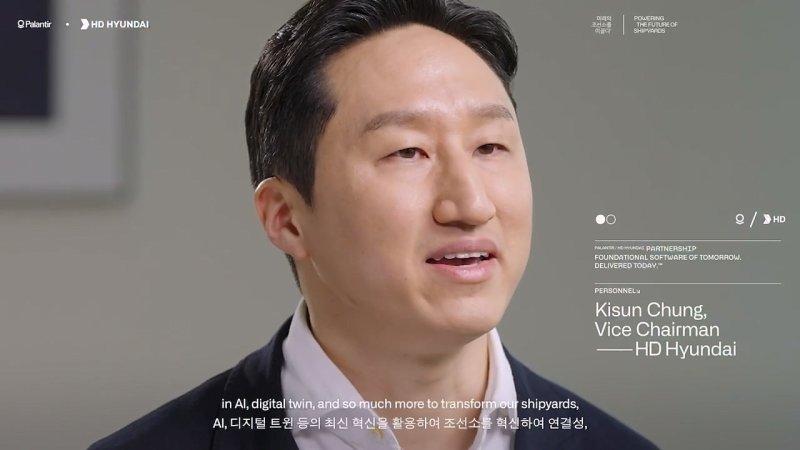 정기선 HD현대 수석부회장이 세계적인 빅데이터 기업 팔란티어 테크놀로지스의 홍보영상에서 '미래형 조선소'에 대해 설명하고 있다. HD현대 제공