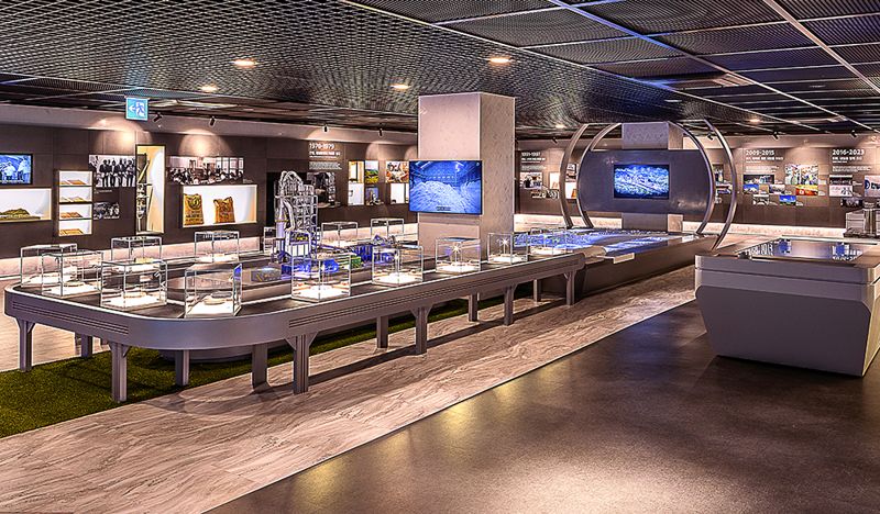24일 한일시멘트에 따르면 약 400㎡ 넓이의 역사관에 들어서면 160인치 투명 LED를 통해 재생되는 웰컴 영상부터 만나게 된다. 석회석 등 원료들이 시멘트로 변하는 과정을 표현한 영상이다. 동선은 벽면을 따라 이어진다. 우리나라 시멘트 산업 현황, 한일시멘트의 60년 역사, 계열회사 및 사업부문 소개가 벽을 따라 전시된다.