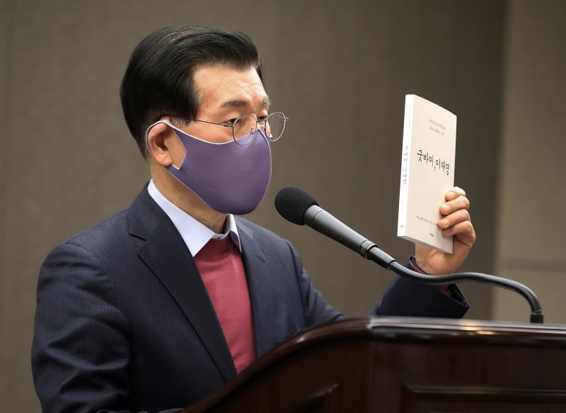 장영하 변호사가 지난 2022년 2월 3일 오후 서울 중구 프레스센터에서 기자회견을 열고 이재명 더불어민주당 대선 후보 배우자 김혜경씨의 경기도 공무원 사적 유용 의혹 등과 관련한 형사고발 계획을 설명하며 자신의 저서 '굿바이 이재명'을 들어보이고 있다. /사진=뉴스1