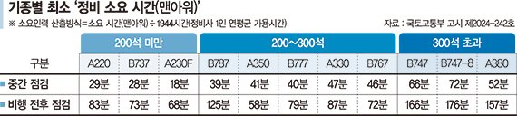 국토부는 지난해 5월 '항공기 등록에 필요한 정비 인력 산출 기준 제정안'을 통해 △계획 정비 △비계획 정비 △특별 정비 인력에 대한 산출 방식을 도입했다. 단위 기간 동안 수행된 모든 정비 항목을 기준으로 정비에 소요된 총 시간(맨아워)에 정비사 1인의 연평균 가용 시간을 나눠 필요 인력을 산출하는 방식이다.