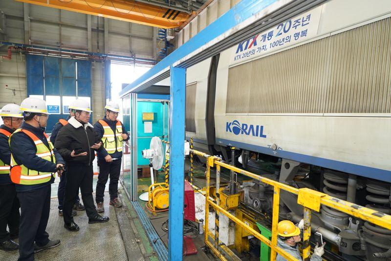 [파이낸셜뉴스] 한문희 코레일 사장(오른쪽 두번째)이 27일 오후 부산 철도차량정비단에서 고속열차 정비 현황을 점검하고 있다. 한 사장은 앞서 이날 부산역에서 역 승강장과 맞이방, 에스컬레이터 등 이용객 편의시설을 둘러보고, 고객 동선과 혼잡도 관리 대책을 점검했다.