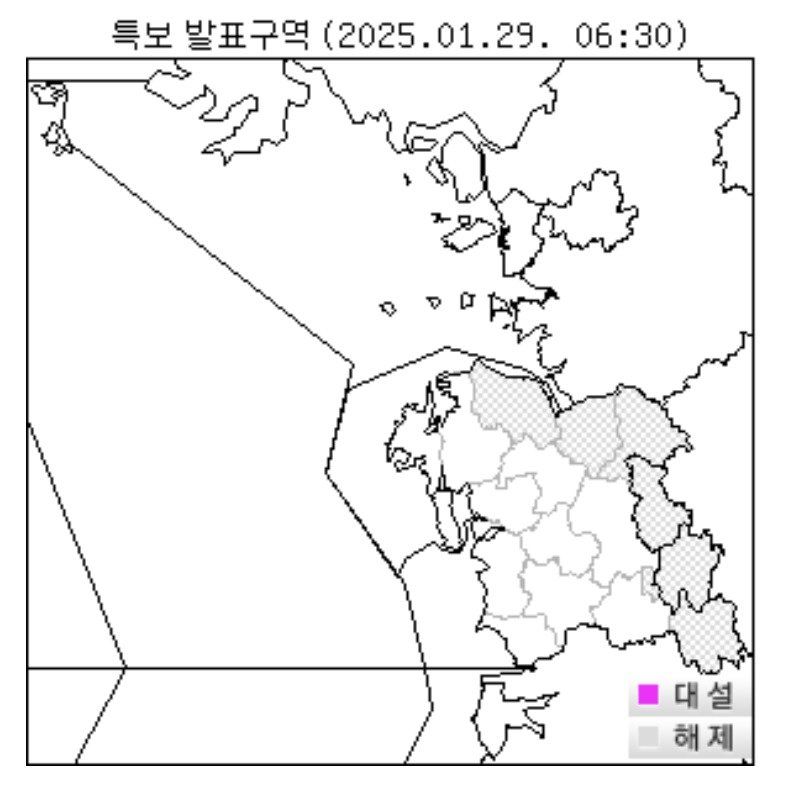 기상청은 29일 오전 6시 30분을 기해 대전과 충남 천안·아산·금산·당진·계룡에 내린 대설주의보를 해제했다.