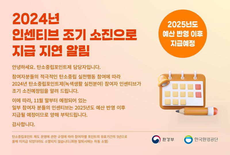 3일 환경부에 따르면 지난 연말 탄소중립포인트제 예산소진에 따라 인센티브 지급 대상자 중 일부는 지급받지 못한 상황이다. 환경부는 미지급분은 2025년 예산반영 이후 지급한다고 공지한 바 있다. 미지급된 인센티브는 5년간 탄소중립포인트제 운영규정에 따라 5년간 소멸되지 않는다는 설명이다.