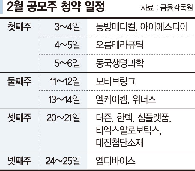설 연휴 이후 공모주 시장이 활기를 띨 전망이다. 다음달에 무려 13곳의 기업공개(IPO) 일반 청약이 대기하고 있어서다. 특히 2월 셋째주에는 5곳의 기업이 일반 청약을 앞둬 '공모주 슈퍼위크'가 열릴 것으로 보인다. 30일 금융감독원 전자공시시스템에 따르면 올해 2월에 일반 투자자 대상으로 공모 청약을 받는 기업은 총 13곳이다. 이달 8곳과 비교해도 증가세가 두드러진다.