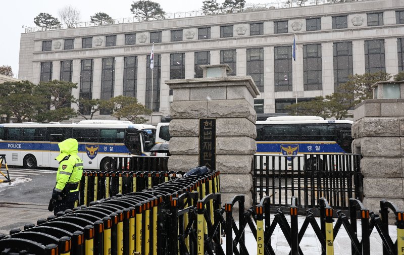 31일 내주 윤석열 대통령 탄핵심판 5차, 6차 변론기일을 앞둔 서울 종로구 헌법재판소 앞에 경찰이 근무를 서고 있다./사진=연합뉴스
