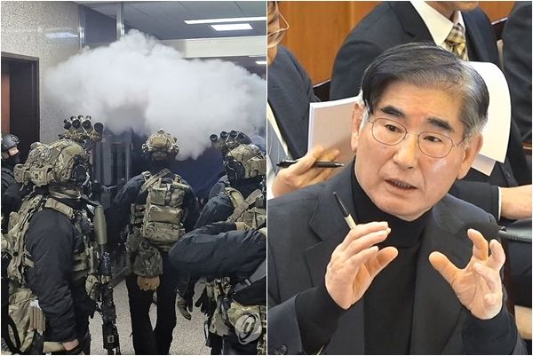 지난해 12월 4일 새벽 국회 본청에 진입한 군 병력이 국민의힘 당대표실쪽에서 본회의장 으로 진입하려 하자, 국회 직원들이 소화기를 뿌리며 진입을 막고 있다.(좌) 김용현 전 국방부 장관(우).사진=연합뉴스