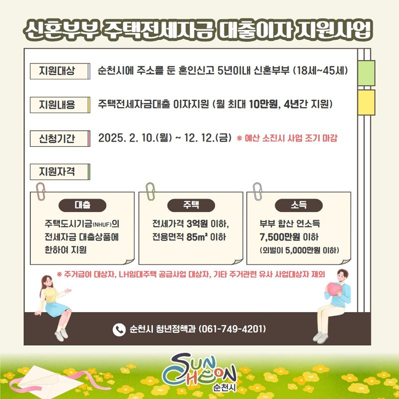 순천시는 신혼부부 청년들의 주거비 경감을 위해 '신혼부부 주택전세자금 대출이자 지원 사업' 신규 대상자를 오는 10일부터 모집한다고 밝혔다.