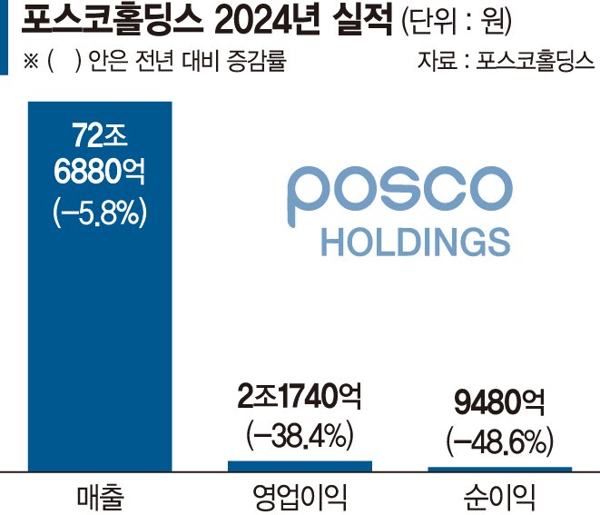 국내외 철강업황 부진과 전기차 캐즘(Chasm·일시적 수요 정체) 등의 영향으로 포스코홀딩스의 지난해 영업이익이 전년보다 40% 가량 줄었다. 포스코홀딩스는 위기극복을 위해 인도, 북미 등 고성장·고수익 시장에 대한 투자를 확대해 글로벌 사업기회를 확보한다는 방침이다. 영업이익이 98% 급감한 포스코퓨처엠은 비상경영체제에 돌입했다.