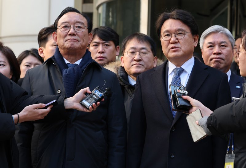 황운하 조국혁신당 원내대표와 송철호 전 울산시장이 4일 서울 서초구 서울고등법원에서 열린 문재인 정부 청와대의 ‘울산시장 선거 개입 의혹’ 항소심 선고를 마치고 나서며 취재진 질문에 답하고 있다. 황운하 원내대표와 송철호 전 시장은 이번 항소심에서 무죄를 선고받았다. /사진=뉴스1