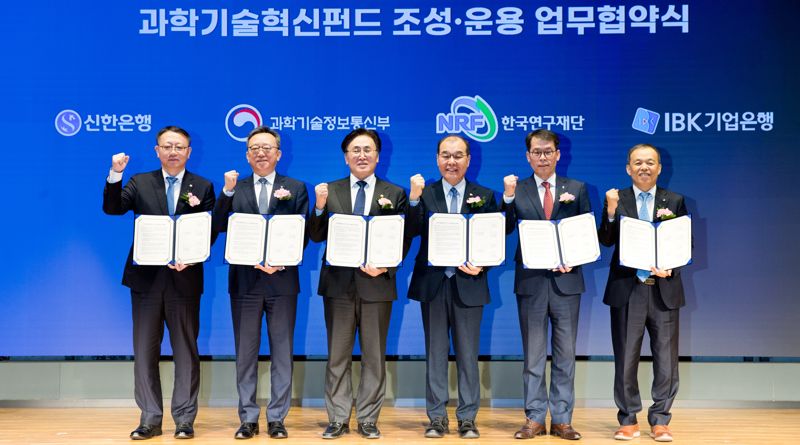 유상임 과학기술정보통신부 장관은 4일 서울 여의도 TP타워에서 신한은행, 중소기업은행, 우리은행, 신한자산운용, 한국연구재단과 '과학기술혁신펀드' 조성을 위한 업무협약(MOU)을 체결했다.