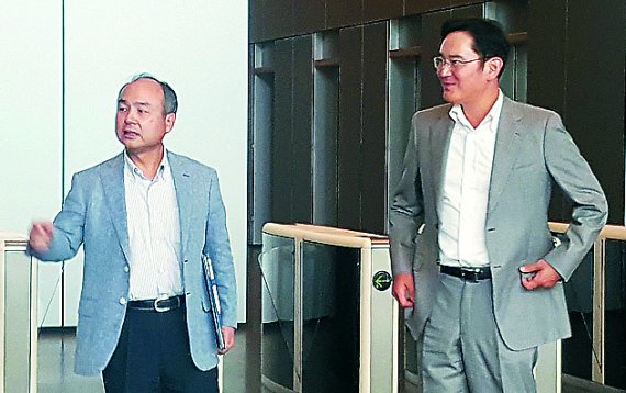 과거 손정의 소프트뱅크 회장(왼쪽)과 이재용 삼성전자 부회장(오른쪽)이 회동했을 당시 모습. 뉴스1