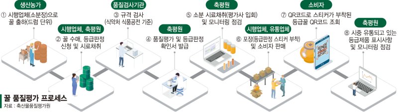 4일 축평원에 따르면 꿀등급제는 벌꿀의 생산과 소분(꿀을 작은 단위로 나눠 포장)과정에서 품질에 영향을 주는 각 단계별 요인에 대한 관리 및 꿀의 품질을 검사해 평가하는 제도다. 품질 차별성을 갖춘 꿀 등급판정과 정보제공을 통해 수입 꿀과 시장 경쟁력을 높이기 위해 마련됐다.