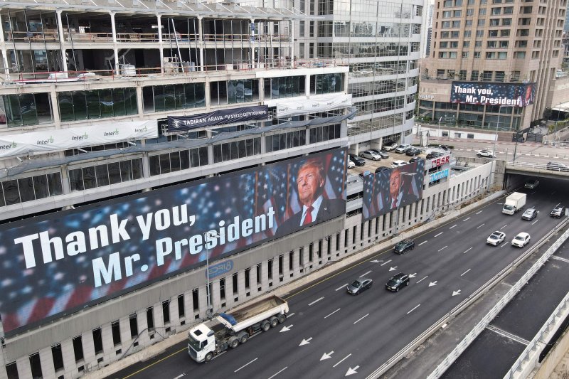 5일(현지시간) 이스라엘 텔아비브 시내에 "대통령 각하 감사합니다"라는 문구와 함께 도널드 트럼프 미국 대통령의 사진이 담긴 광고가 걸려 있다.AFP연합뉴스