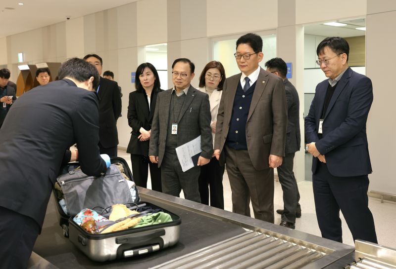 [파이낸셜뉴스] 고광효 관세청장(오른쪽 두번째)이 6일 오전 인천국제공항 제1여객터미널을 찾아 여행자 통관현장을 점검하고 있다. 관세청은 최근 국경단계에서 여행자를 통한 마약 밀수를 효과적으로 차단하기 위해 단속을 강화하고 있다.
