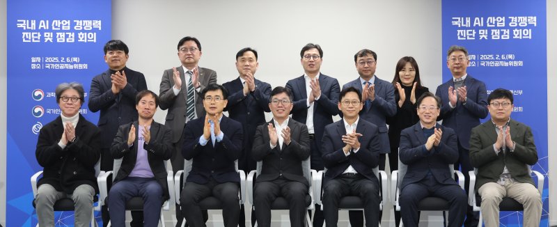 강도현 과학기술정보통신부 2차관이 6일 오전 서울 중구 국가인공지능위원회에서 열린 '국내 AI 산업 경쟁력 진단 및 점검 회의'에서 AI 관련 관계기관 및 국내 기업 관계자들과 기념촬영을 하고 있다. /사진=뉴시스