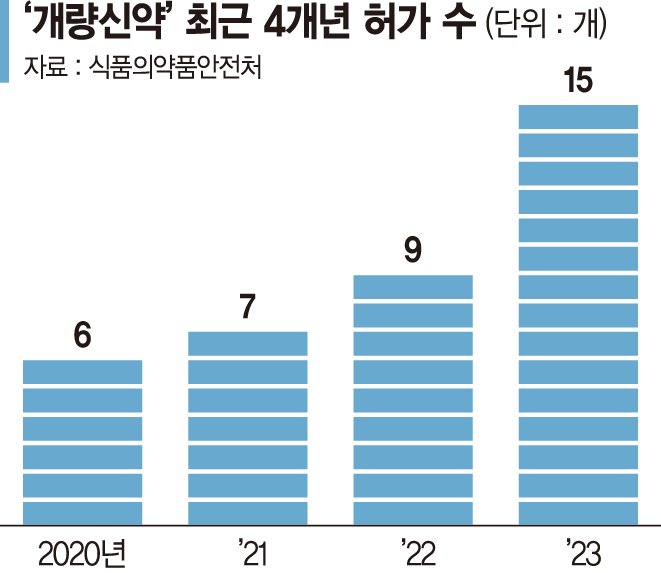 6일 제약업계에 따르면 최근 개량신약 허가 건수는 증가하는 추세를 보이고 있다. 최근 4개년 식품의약품안전처가 허가한 개량신약은 지난 2020년 6개, 2021년 7개, 2022년 9개, 2023년 15개로 매년 증가하고 있다.