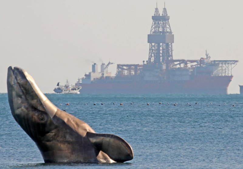 지난해 12월 부산 서구 송도해수욕장 앞바다에 있는 고래 조형물 뒤로 동해심해 가스전 유망구조에 석유·가스가 묻혀 있는지를 확인할 시추선 '웨스트 카펠라'호가 입항해 있다. 뉴스1 제공