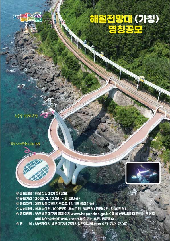 구청 홈페이지에서 신청서를 내려받아 전자우편이나 관광시설관리사업소(해운대해변로 264, 2층)에 우편 발송 또는 방문 접수하면 된다. 1인당 1편씩 응모할 수 있다.