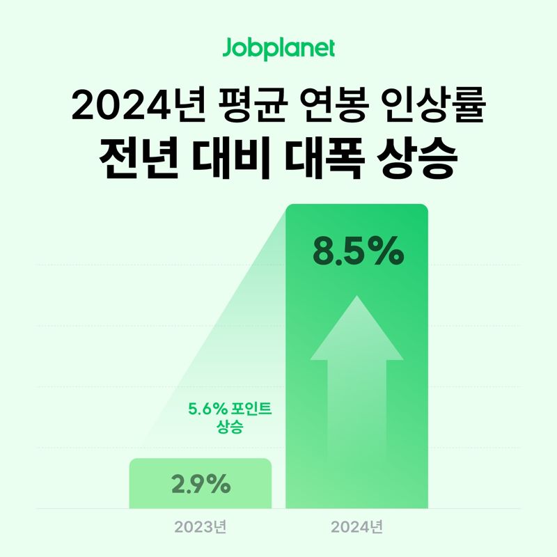 7일 잡플래닛이 개인 인증을 통해 고용보험 등으로부터 수집한 최근 3개년 약 127만 건의 인증 연봉 데이터를 분석한 결과, 2024년 전체 평균 연봉 인상률은 8.5%로, 전년 2.9% 대비 5.6%p 상승한 것으로 나타났다.