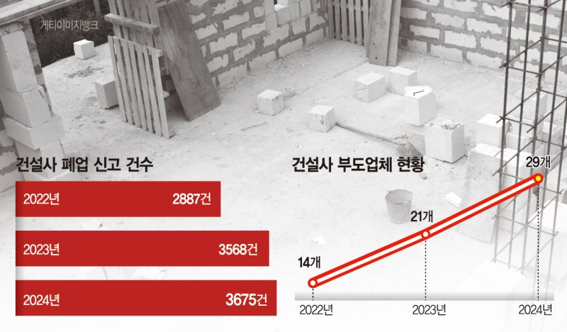 국토교통부에 따르면 지난해 368개 개발업체가 폐업신고를 했다. 이는 관련 통계 공개 이후 역대 최고치이다. 건설사 폐업 신고 건수도 지난 2024년 3675건으로 늘었고, 29개 업체는 부도 처리되는 등 업계에 연쇄 줄도산 공포가 번지고 있는 상황이다.