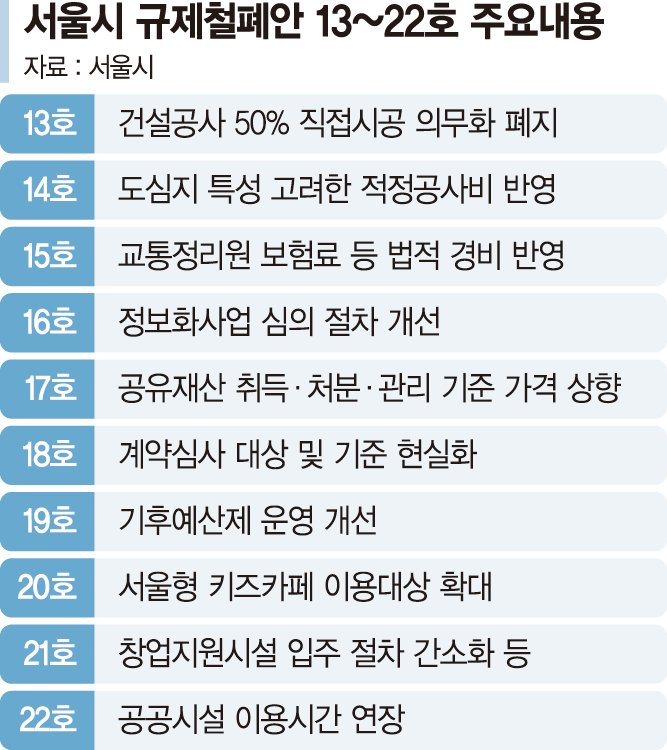 서울시가 공공건설 분야 관행적 규제와 행정 규제, 생활 규제 등 10건을 추가로 철폐한다. 지난 한 달간 서울시 모든 부서와 직원들이 시민 입장에서 폐지·개선할 규제를 집중적으로 발굴하고 아이디어를 논의한 결과다.