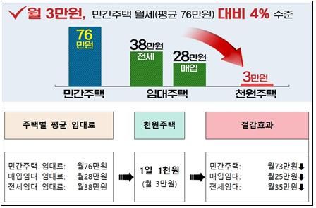 공급주택은 국민주택 규모(전용면적 85㎡) 이하로 방 2개 이상인 주택이다. 천원주택은 월 임대료 3만원으로 6년간 거주 가능하고 이후 희망자에 한해 추가로 4년(자녀가 있는 경우 8년) 간 시중 임대료 시세의 30~50% 수준으로 거주 가능하다.