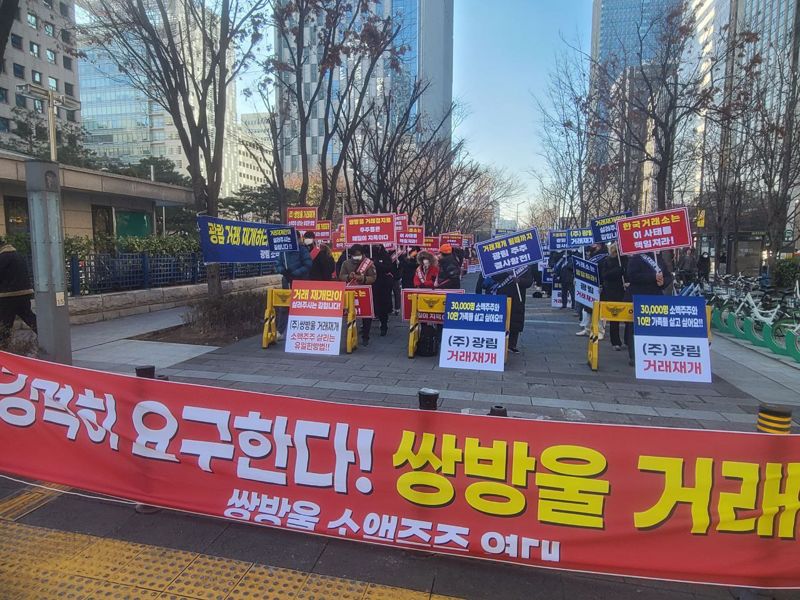 쌍방울 소액주주연대가 지난 달 서울 여의도 한국거래소 앞에서 거래재개를 요구하는 집회를 열고 있다.