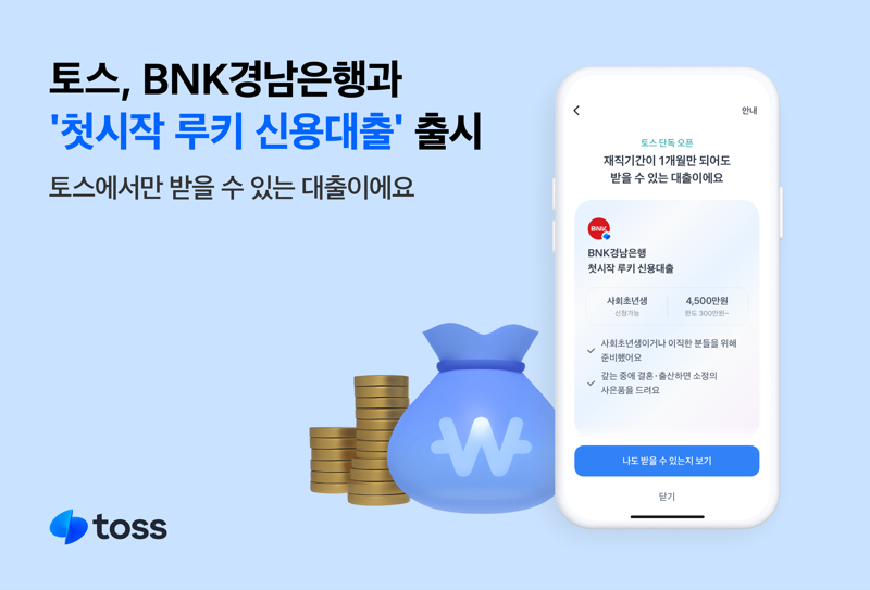 [파이낸셜뉴스] 비바리퍼블리카(토스)가 BNK경남은행과 함께 사회초년생을 위한 '첫시작 루키 신용대출'을 출시했다고 10일 밝혔다.