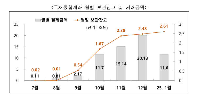 국채통합계좌 이용 규모는 스톡익스체인지(FTSE) 러셀이 한국 국채를 세계국채지수(WGBI)에 편입한다고 발표한 지난해 10월부터 증가했다. 특히 지난해 12월에는 외국인 투자자 간 역외거래 확대로 월별 결제 금액이 처음으로 20조원을 넘어서기도 했다.