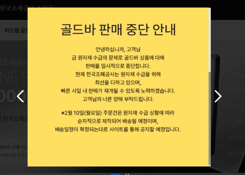 조폐공사는 공지문에서 "금 원자재 수급 문제로 골드바 상품에 대한 판매를 일시 중단한다"면서 "현재 공사는 원자재수급을 위해 최선을 다하고 있으며 빠른 시일 내에 판매가 재개될 수 있도록 노력하겠다"고 밝혔다.