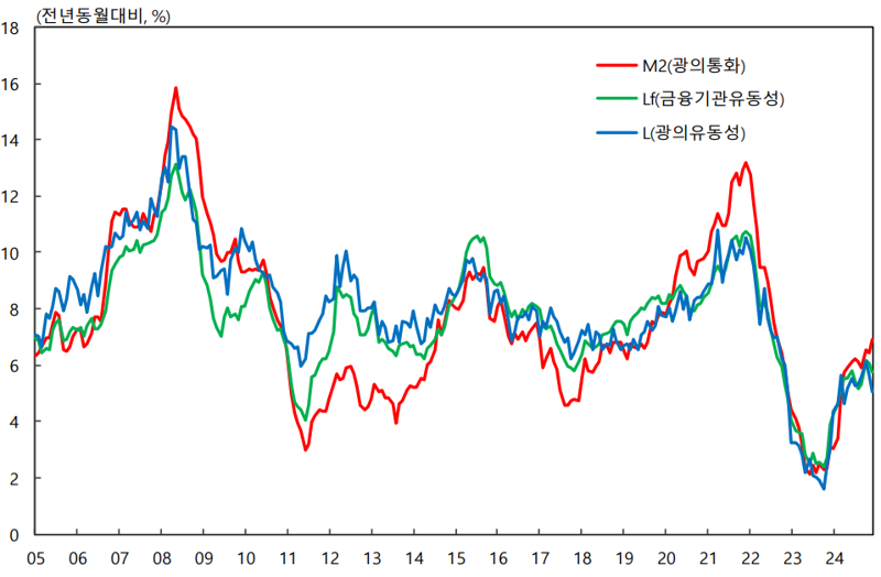 M2는 2023년 3월부터 5월까지 1999년 이후 24년 만에 처음으로 3개월 연속 하락세를 나타냈다. 이후 2023년 6월부터 반등해 2024년 12월까지 19개월 연속 상승세를 기록 중이다. 12월 M2의 전년 동월 대비 증가율은 6.9%로 전월 증가폭(6.4%)을 상회했다.