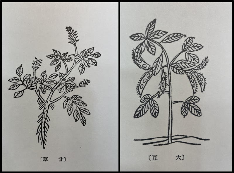 감두탕(甘豆湯)은 감초(甘草)와 흑두(黑豆, 검은콩)으로 구성된 해독제다. 그림은 <본초강목>에 그려진 감초(甘草)(왼쪽)와 대두(大豆)인데, 대두는 황색과 검은색 중 검은색만을 약용한다.