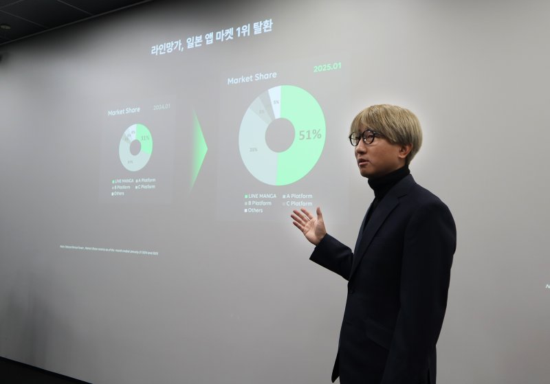 라인망가 운영사인 라인 디지털 프론티어 김신배 대표이사 겸 최고성장책임자(CGO)가 13일 일본 도쿄 LDF 오피스에서 열린 기자간담회에서 라인망가의 성과와 현황, 전망 등을 발표하고 있다. 네이버웹툰 제공