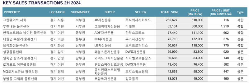 최대 규모 거래는 하반기에 공급된 그린웨이브 시화로 JB자산운용이 시화로드로부터 5100억원에 선매입했다. 또한 외국계 투자사들의 참여가 두드러졌다. 그래비티자산운용은 부천 내동 물류센터를 3000억원에 매입했으며 GIC가 투자자로 참여했다. LB자산운용은 스위스 파트너스 그룹과 함께 브릭 화성 물류센터를 1180억원에, 페블스톤자산운용은 블랙스톤과 성광물류센터를 835억원에 매입했다. 하이트만은 와이드크릭 자산운용과 함께 방초리 물류센터를 830억원에 사들였다.