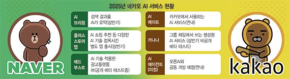 지난해 실적 성적표를 받아들인 양대 인터넷 플랫폼 네이버와 카카오가 올해는 각각 다른 인공지능(AI) 전략을 내세우며 'AI 기반 플랫폼'으로 도약을 꾀한다. 두 기업 모두 AI를 무기로 내세웠지만 방향성은 같은 듯 다르다. 네이버는 자체 개발한 AI를 엔진 삼아 검색, 커머스 등의 카테고리 영향력을 높이고, 후발주자 카카오는 오픈AI와 협업해 속도를 붙일 예정이다. '네이버플러스 스토어', '카카오의 카나나' 등 성장 가능성이 큰 영역은 별도 앱으로 분리 출시한다는 점은 공통적이다.