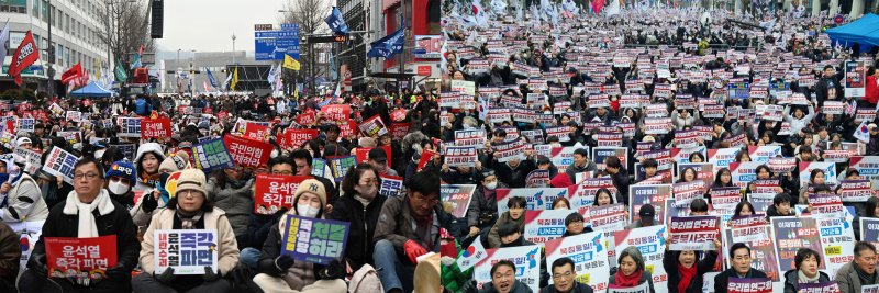 '5·18민주화운동 항쟁지' 광주 금남로 일대에서 50m가량 거리를 두고 윤석열 대통령의 탄핵 찬·반 집회가 각기 열렸다. 왼쪽은 '윤석열정권 즉각퇴진·사회대개혁 광주비상행동' 윤 대통령 탄핵 촉구 집회. 오른쪽은 '세이브코리아' 윤 대통령 탄핵 반대 촉구 기도회. 사진=뉴시스