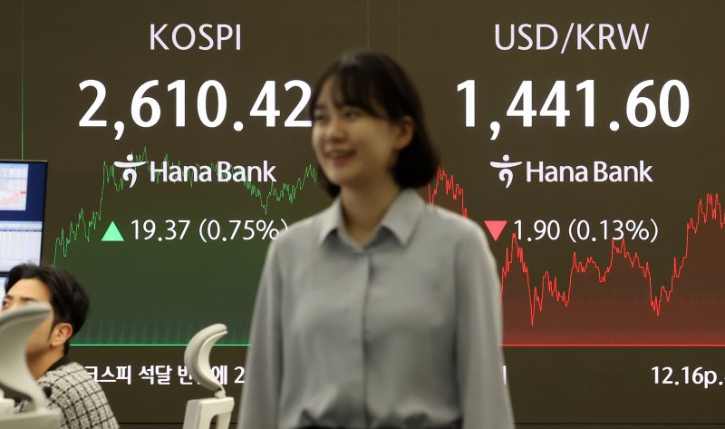코스피지수가 전 거래일보다 19.37p(0.75%) 오른 2610.42에 마감한 17일 서울 중구 하나은행 딜링룸 전광판에 지수가 표시되고 있다. 이날 코스닥지수는 전 거래일보다 12.16p(1.61%) 상승한 768.48에 장을 마쳤다. 뉴시스