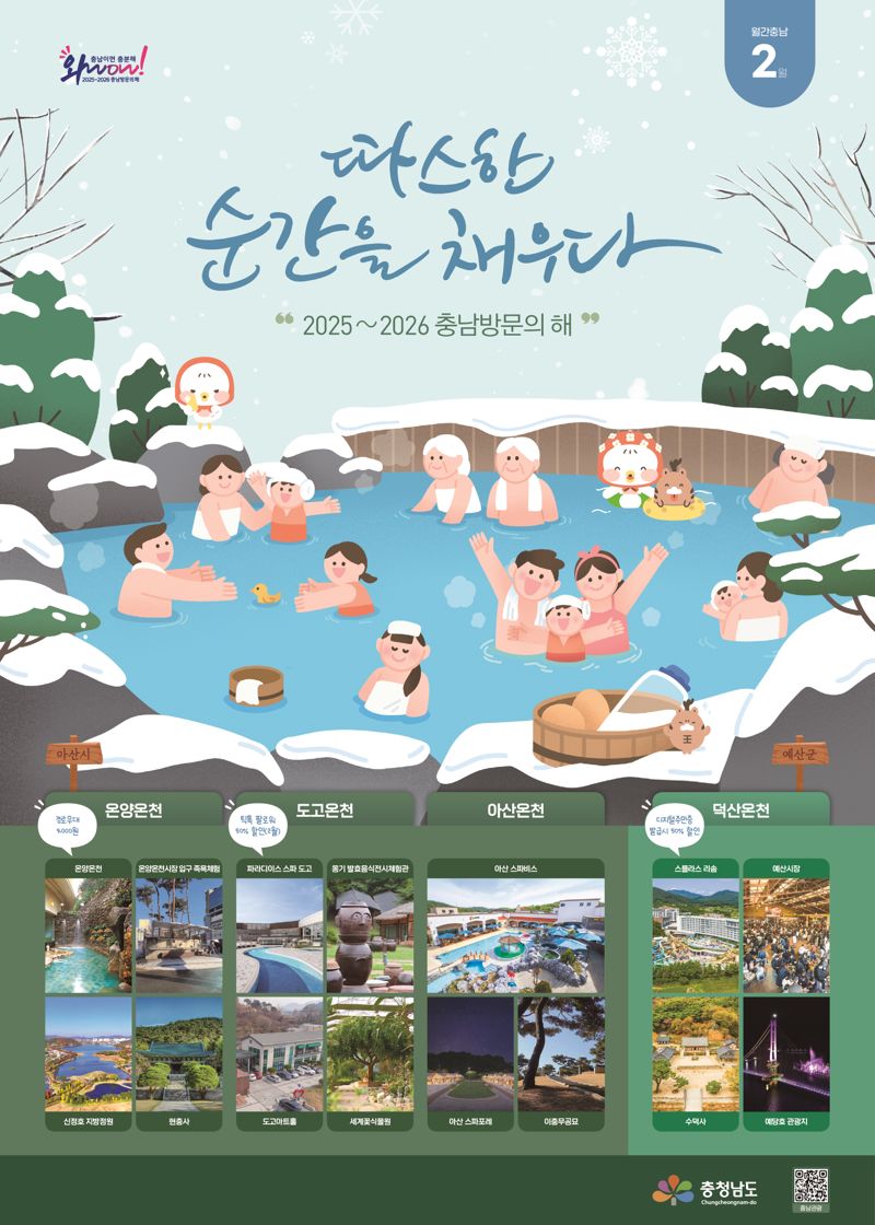 [파이낸셜뉴스] 충남도가 2025∼2026 충남 방문의 해를 맞아 매달 여행 주제를 설정해 지역 관광자원을 소개하는 ‘월간 충남’을 운영한다. 이달 여행 주제는 ‘따스한 순간을 채우다’로, 사랑과 온기가 가득한 계절에 가족·친구·연인과 함께 즐기기 좋은 온천 명소를 소개한다.