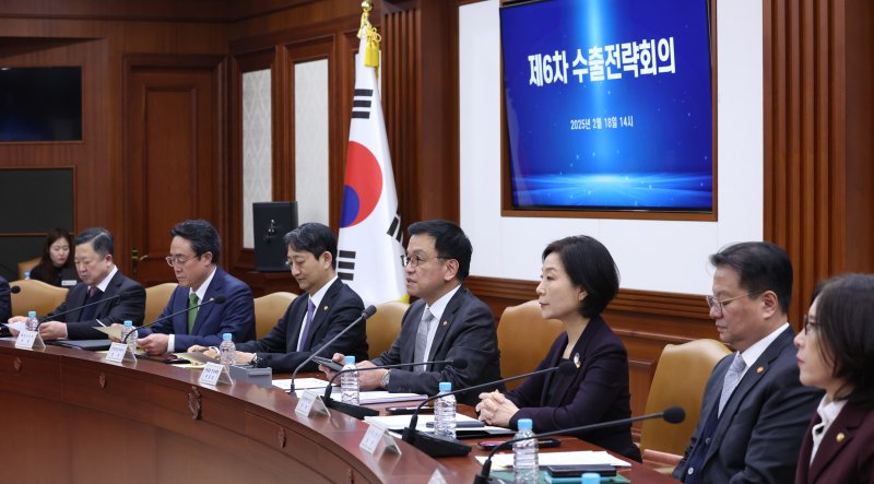 최상목 대통령 권한대행 부총리 겸 기획재정부 장관이 18일 정부서울청사에서 수출전략회의를 하고 있다. 오른쪽은 오영주 중소벤처기업부 장관. 대통령실통신사진기자단