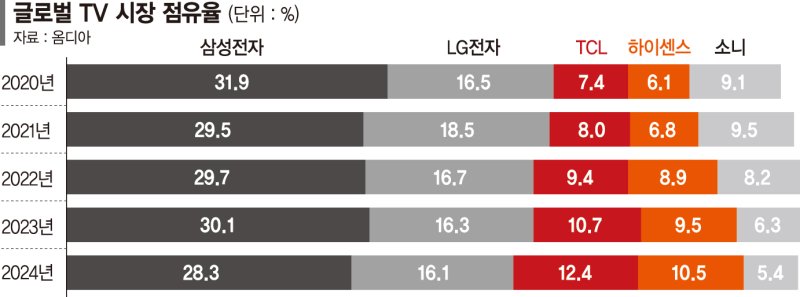 실제 옴디아에 따르면 중국 3대 TV 브랜드인 TCL·하이센스·샤오미의 지난해 출하량 기준 글로벌 TV 시장 점유율(31.3%)은 삼성전자와 LG전자의 합산 점유율(28.4%)보다 높았다. 중국 브랜드의 TV 시장 점유율이 한국을 앞선 건 지난해가 처음이다. 이에 삼성전자와 LG전자는 지금과 같이 프리미엄 시장에 집중, 중국 기업과 격차를 확대할 방침이다.