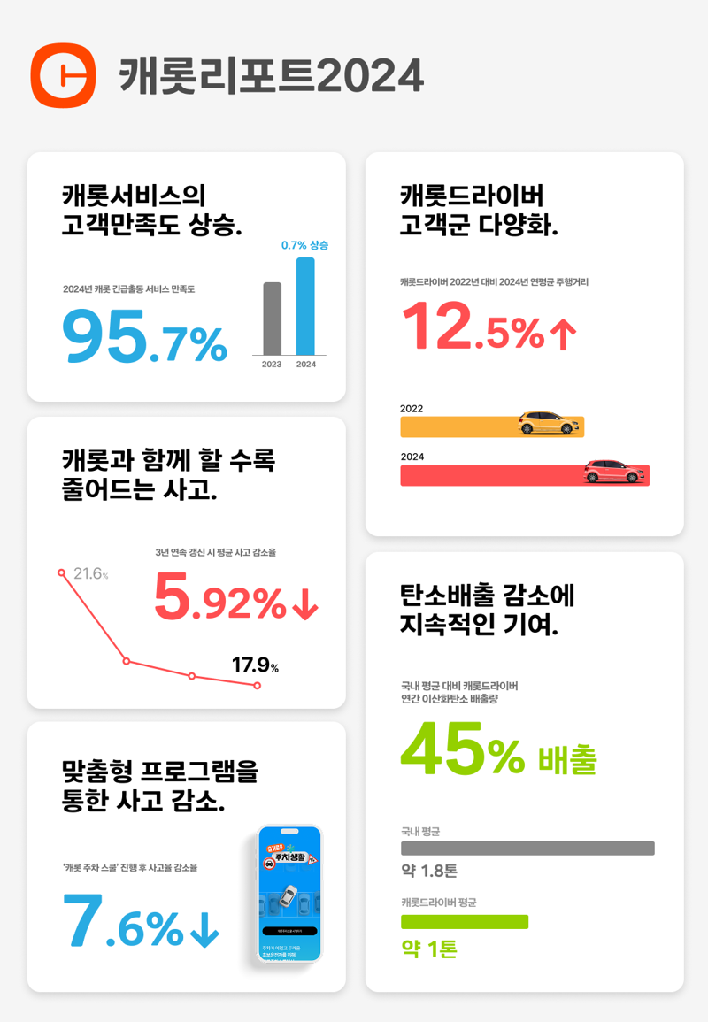 캐롯의 데이터 기반 안전 주행 프로그램도 도로 위 안전성 개선에 기여하고 있다. 보험 갱신 1회차마다 평균 사고율이 5.92% 감소했으며, 캐롯이 운영하는 ‘주차 스쿨’ 프로그램 참여 고객의 사고율은 7.6% 줄었다. 아울러 지난해 기준 긴급출동 서비스 고객만족도가 95.7%를 기록하며 2023년 대비 0.7% 상승하는 등 캐롯의 차별화된 서비스가 고객들에게 높은 만족도를 제공하고 있다는 설명이다.