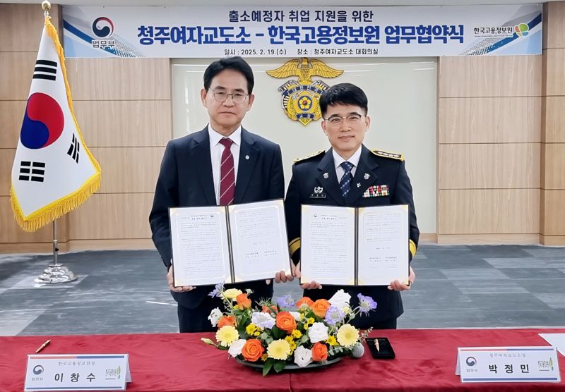 19일 한국고용정보원 이창수 원장(왼쪽)과 청주여자교도소 소장이 출소예정자 사회복귀지원 업무협약을 체결하고 있다. 한국고용정보원 제공.