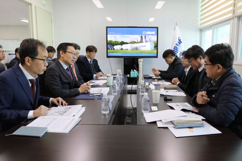 [파이낸셜뉴스] 김완기 특허청장(왼쪽 두번째)이 21일 충북 청주의 기체분리막 제조기업인 ㈜에어레인를 방문, 간담회를 진행하고 있다. 김 청장은 특허청이 지원한 글로벌 지식재산(IP)스타기업 육성 사업의 성과를 확인하고, 기업 현장의 애로사항을 파악하기 위해 에어레인을 방문했다.