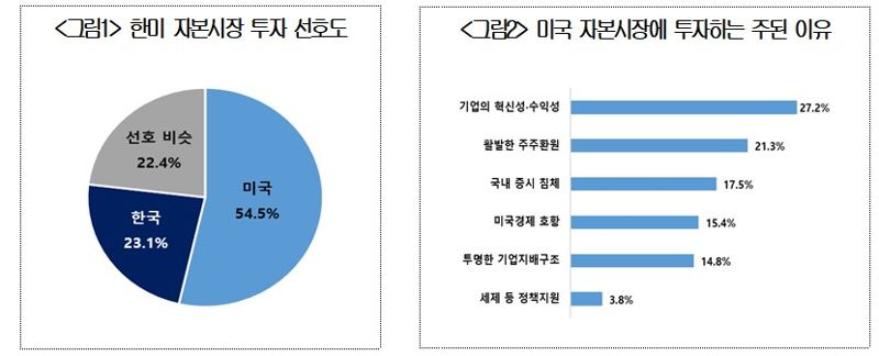 대한상공회의소가 23일 자체 온라인 플랫폼인 '소플'을 통해 국민 1505명을 대상으로 실시한 '한-미 자본시장에 대한 국민인식 조사'에 따르면, 응답자의 54.5%는 한-미 자본시장 중 미국 자본시장을 선호하는 반면 국내 자본시장을 선호한다는 응답은 23.1%에 그쳤다.