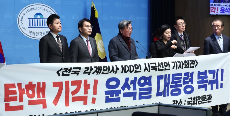 국내 학계, 법조계, 교육계, 언론계, 문화계, 종교계, 시민사회계 인사 100인의 이름으로 이날 국회 소통관에서 윤 대통령 탄핵 기각과 복귀를 희망하는 시국선언이 발표됐다.