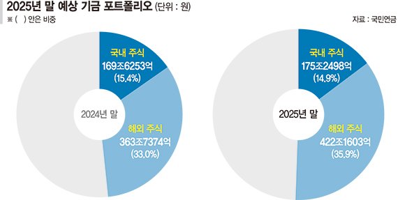 연기금은 해외 주식 비중도 늘리고 있다. 올해 말 연기금이 예상한 해외 주식 투자규모는 422조1603억원으로 전체 연기금 투자 규모의 35.9%에 달한다. 지난해 말 기준 연기금의 해외 주식 투자규모는 363조7374억원이다.