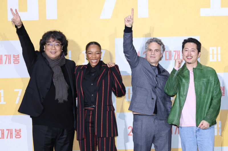 '미키 17' 봉준호 감독과 출연진들이 내한 기자간담회에서 함께 포즈를 취하고 있다. 왼쪽부터 봉준호 감독, 배우 나오미 애키, 마크 러팔로, 스티븐 연. 뉴스1