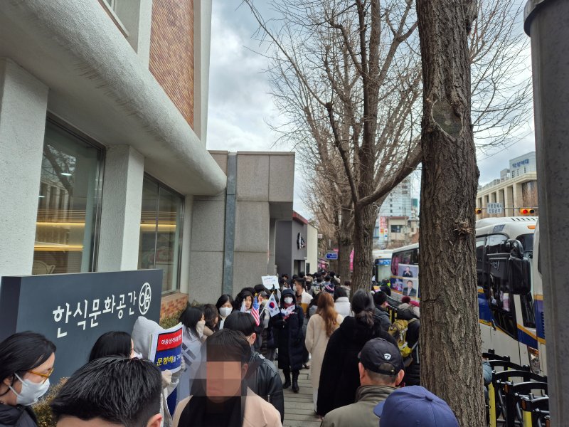 경찰은 이날 오전 헌재 정문 앞 도로와 안국역 인근에는 경찰 기동대 64개 부대 약 3800명을 배치하고 경비를 강화했다. 윤 대통령이 탄핵심판에 처음 출석한 지난달 21일 이후 가장 큰 규모다.